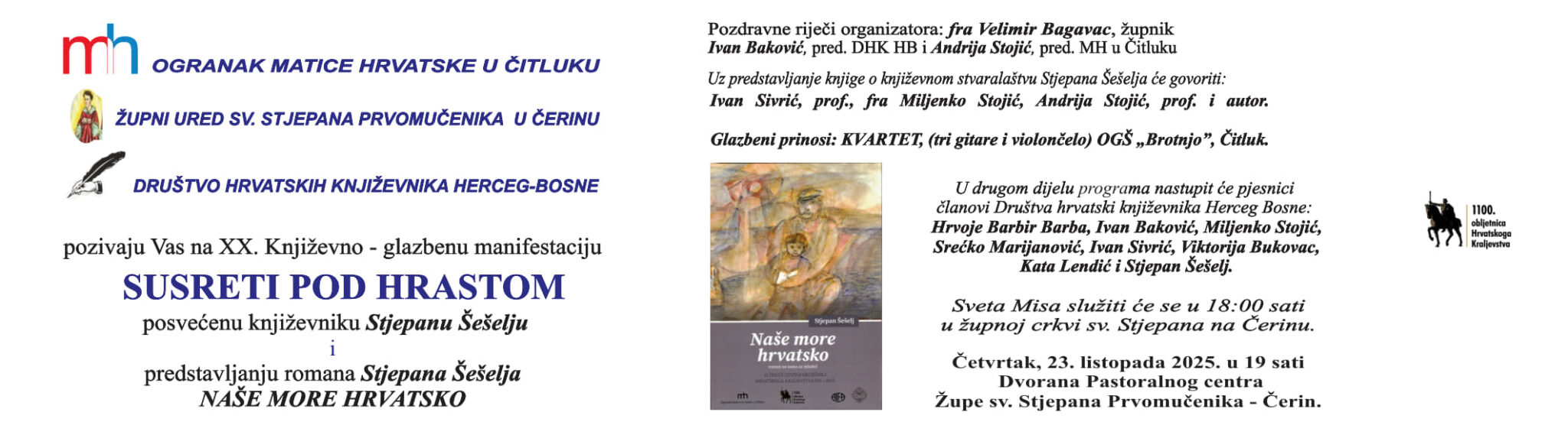 Tradicionalna manifestacija u organizaciji Ogranka Matice hrvatske u Čitluku, Društva hrvatskih književnika Herceg Bosne (DHK HB) i Župe sv. Stjepana Prvomučenika – Čerin započet će zajedničkim misnim slavljem u čerinskoj župnoj crkvi, dok će u 19.00 u dvorani Pastoralnog centra Župe sv. Stjepana Prvomučenika – Čerin biti predstavljen roman Stjepana Šešelja »Naše more Hrvatsko«. Inače, ovogodišnji »Susreti pod hrastom« posvećeni su upravo ovom književniku. O romanu će govoriti prof. Ivan Sivrić, književnik fra Miljenko Stojić, prof. Andrija Stojić i sam autor.