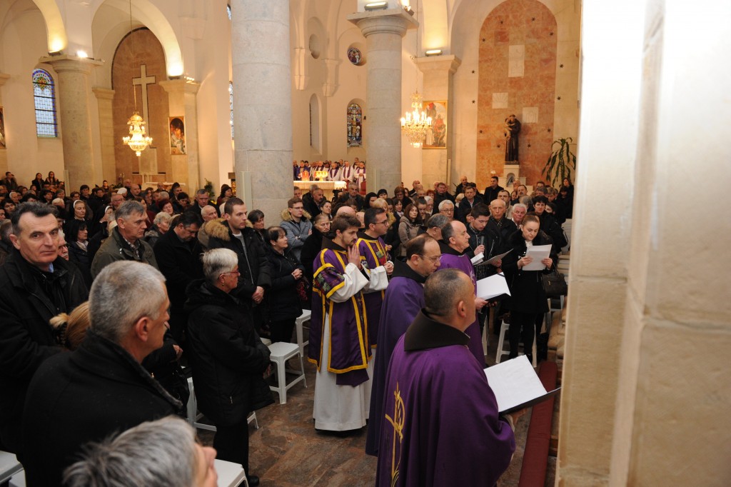 Mostar, 14. veljače 2018. (bljesak.info) – U crkvi Sv. Petra i Pavla u Mostaru večeras je održana sv. misa zadušnica u spomen na pobijene fratre i vjernike Mostara i okolice u Drugom svjetskom ratu, poraću i Domovinskom ratu. Misno slavlje je predvodio gvardijan franjevačkog samostana u Mostaru fra Danko Perutina, uz suslavlje vicepostulatora fra Miljenka Stojića, vikara provincije fra Ivana Ševe, generalnog vikara hercegovačkih biskupija don Željka Majića te još 15 svećenika. Prostrana samostanska crkva bila je ispunjena vjernicima.