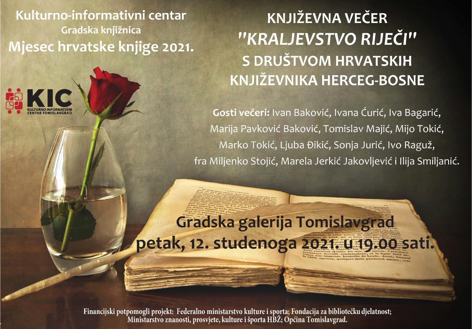 Tomislavgrad, 12. studenoga 2021. (M. P. / tomislavcity.com) – Večeras je u tomislavgradskoj galeriji Kulturnoinformativnoga centra, u suradnji s Društvom hrvatskih književnika Herceg Bosne (DHK HB), upriličena književna večer »Kraljevstvo riječi«. Slušateljstvo je imalo prigodu čuti tekstove profiliranih pjesnika koji su članovi ili suradnici DHK HB. To su: Ivan Baković, Ivana Ćurić, Iva Bagarić, Marija Pavković Baković, Tomislav Majić, Mijo Tokić, Marko Tokić, Ljuba Đikić, Sonja Jurić, Ivo Raguž, fra Miljenko Stojić, Marela Jerkić Jakovljević i Ilija Smiljanić. Nekolicina njih došla je iz drugih gradova te je svatko od sudionika pružio slušateljstvu dio čarolije književnoga svijeta.