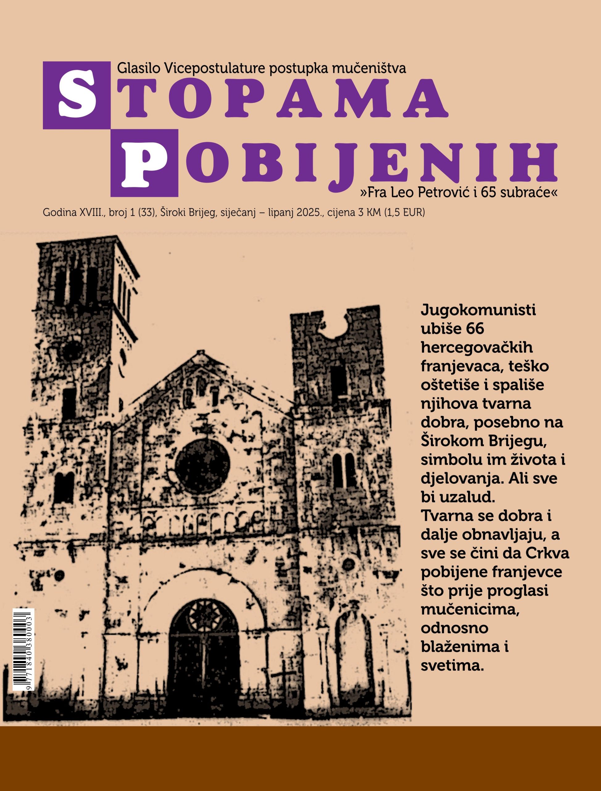 Široki Brijeg, 27. siječnja 2025. (Lucijana Kožul) – Nakon godinu dana izašao je novi, 33., broj glasila »Stopama pobijenih« kojega uređuje Vicepostulatura postupka mučeništva »fra Leo Petrović i 65 subraće« na čelu s vicepostulatorom fra Miljenkom Stojićem. Već godinama ovo glasilo traga za istinom o pobijenim hercegovačkim franjevcima i o pobijenim članovima vjernoga puka Božjega.